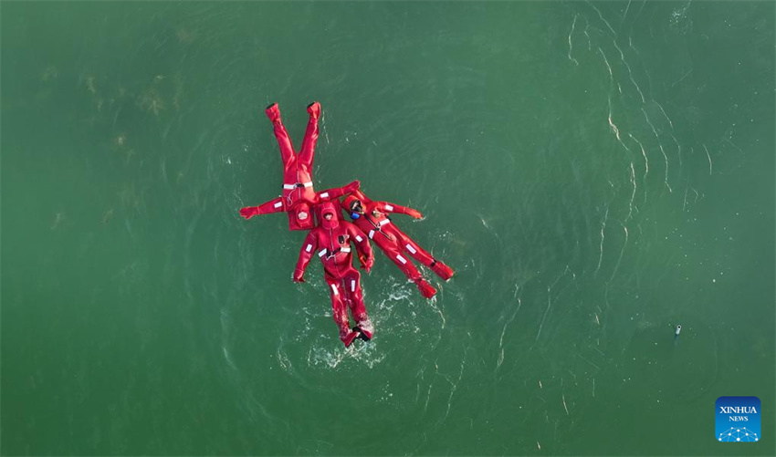 Una foto aérea tomada con un dron muestra a personas con trajes de cangrejo de río flotando en el agua en un parque de Yinchuan, en la región autónoma de la etnia Hui de Ningxia, en el noroeste de China, el 17 de enero de 2026. (Xinhua/Wang Peng).