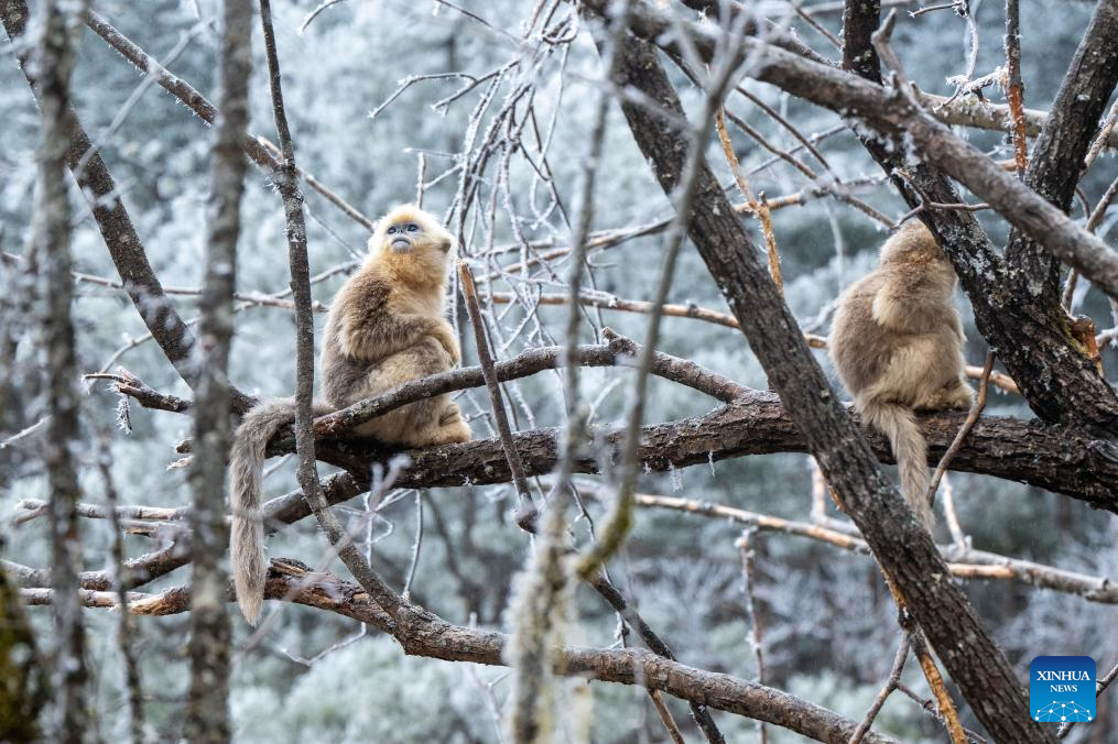 Esta foto tomada el 19 de enero de 2026 muestra monos dorados de nariz chata en el Centro de Investigación del Mono Dorado de Dalongtan, en el Parque Nacional de Shennongjia, bajo la jurisdicción del Distrito Forestal de Shennongjia, provincia de Hubei, en el centro de China. (Xinhua/Du Zixuan).