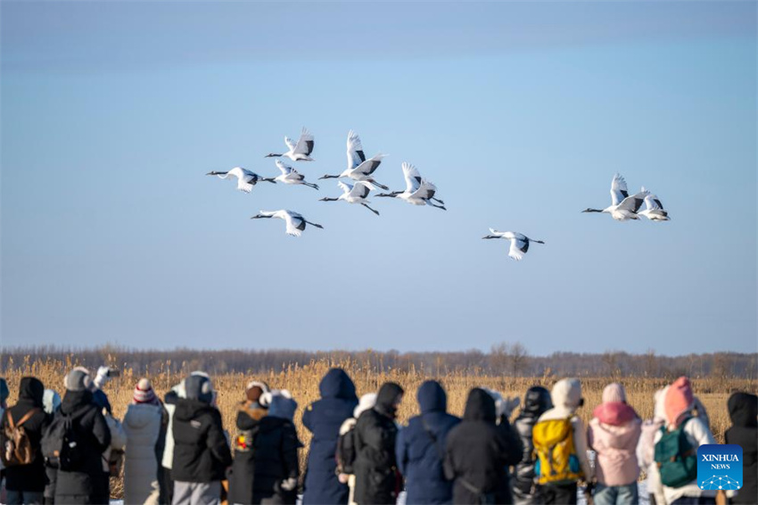 Los visitantes observan las grullas de corona roja en la Reserva Natural Nacional de Zhalong, provincia de Heilongjiang, en el noreste de China, el 21 de enero de 2026. (Xinhua/Zhang Tao).