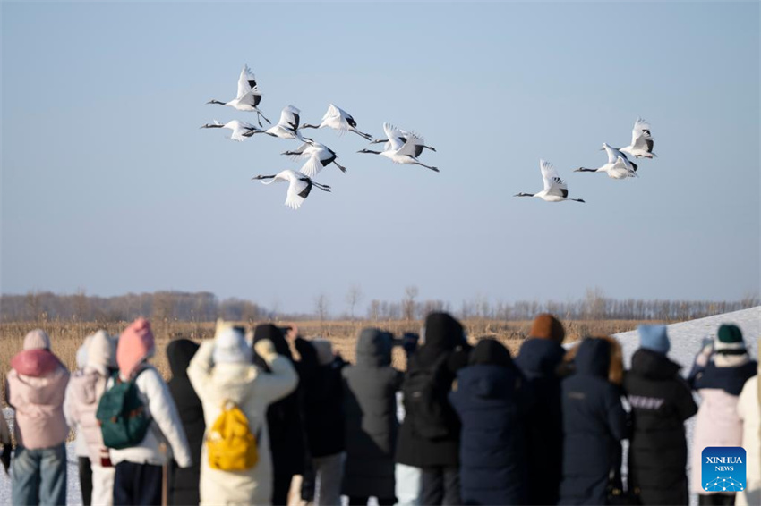 Los visitantes observan las grullas de corona roja en la Reserva Natural Nacional de Zhalong, provincia de Heilongjiang, en el noreste de China, el 21 de enero de 2026. (Xinhua/Zhang Tao).