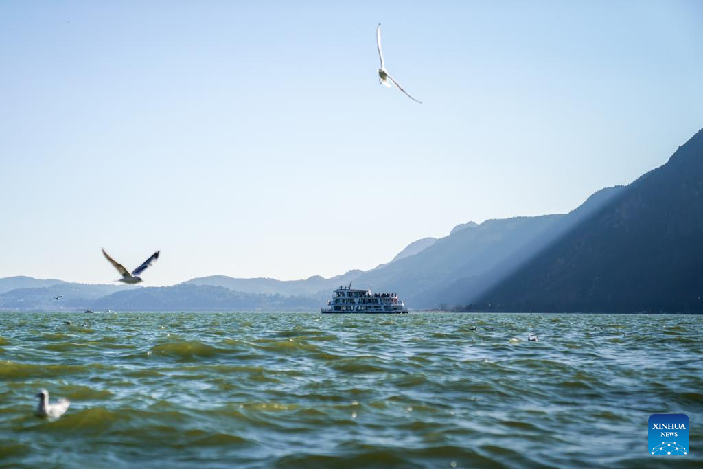 Ferry turístico en el lago Dianchi, en la ciudad de Kunming, provincia de Yunnan, en el suroeste de China, el 22 de enero de 2026. (Xinhua/Peng Yikai).
