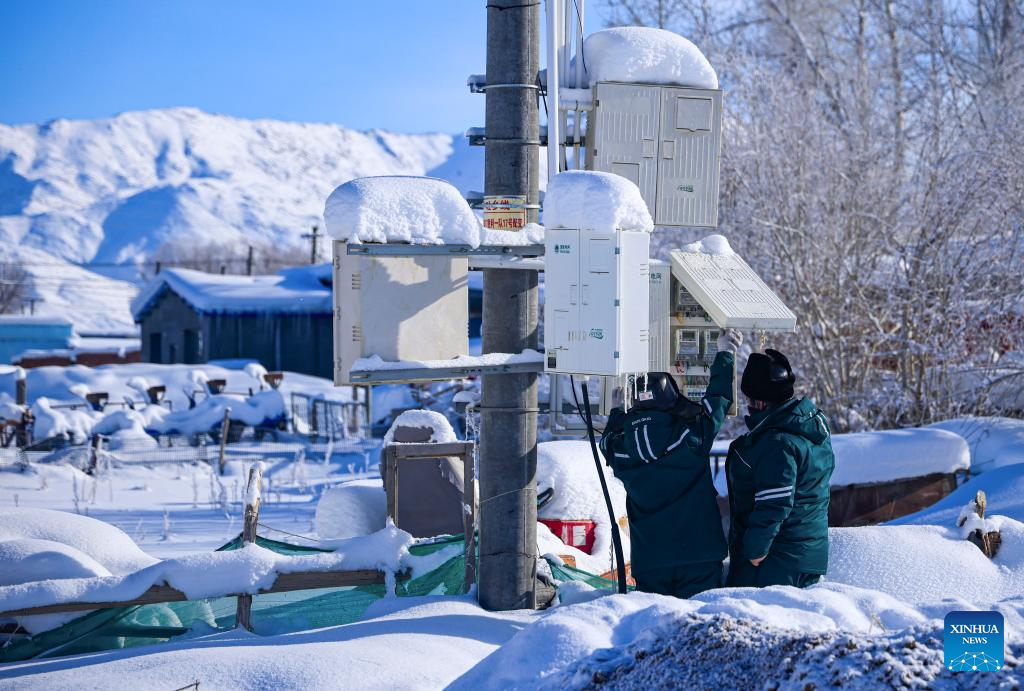 Empleados de la estación de suministro eléctrico comprueban los contadores de electricidad en la localidad de Turgun, en el distrito de Fuyun, prefectura de Altay, región autónoma uigur de Xinjiang, en el noroeste de China, el 16 de enero de 2026. (Foto de Nurbek Nurman/Xinhua).