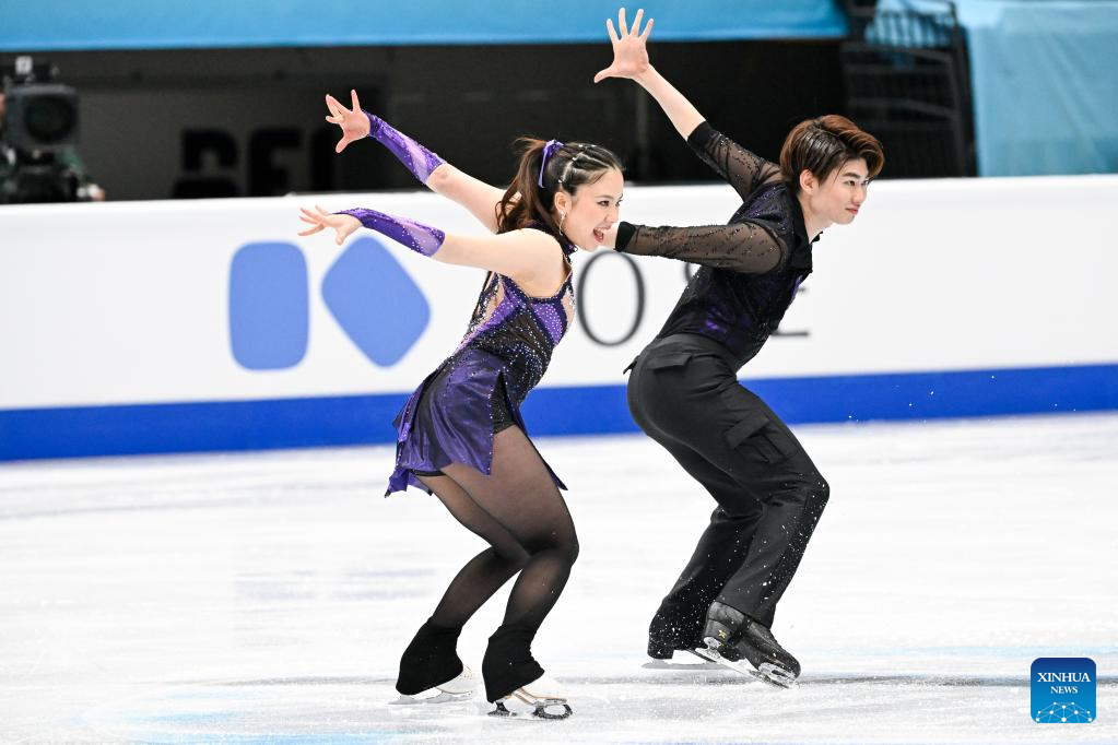 Yoshida Utana (izquierda) y Morita Masaya, de Japón, actúan durante la danza rítmica sobre hielo en el Campeonato de Patinaje Artístico de los Cuatro Continentes de la ISU en Beijing, China, el 22 de enero de 2026. (Xinhua/Ju Huanzong).