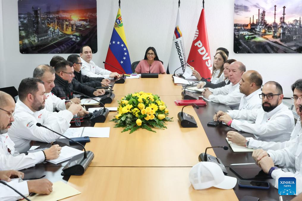 Imagen proveída por la Presidencia de Venezuela de la presidenta encargada venezolana, Delcy Rodríguez (c), participando en una reunión en Puerto La Cruz, en el estado Anzoátegui, Venezuela, el 25 de enero de 2026. La reforma de la Ley Orgánica de Hidrocarburos que impulsa el Gobierno de Venezuela servirá para la "felicidad económica" del país, afirmó el domingo la presidenta encargada, Delcy Rodríguez. (Xinhua/Presidencia de Venezuela)
