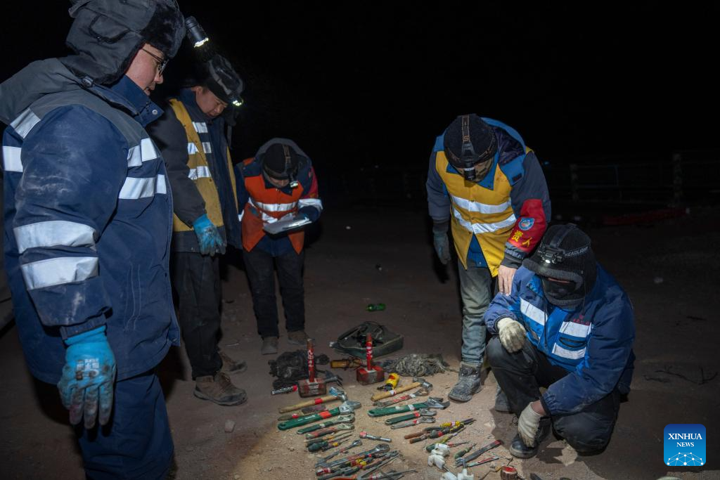 Los trabajadores cuentan sus herramientas tras completar su trabajo en el distrito de Amdo, Nagqu, región autónoma de Xizang, en el suroeste de China, el 23 de enero de 2026. (Xinhua/Tenzing Nima Qadhup).