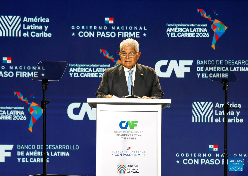 El presidente panameño, José Raúl Mulino, pronuncia un discurso durante el Foro Económico Internacional América Latina y el Caribe 2026 del Banco de Desarrollo de América Latina y el Caribe (CAF), en la Ciudad de Panamá, capital de Panamá, el 28 de enero de 2026. El Foro Económico Internacional América Latina y el Caribe 2026 del CAF se desarrolla en Panamá y cuenta con la participación de mandatarios y delegaciones de distintos países de América Latina y el Caribe, en un contexto marcado por la búsqueda de nuevas estrategias de cooperación e inserción regional en la economía global. (Xinhua/Daniel González)