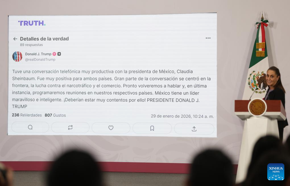 La presidenta mexicana, Claudia Sheinbaum, reacciona durante su conferencia de prensa matutina, en Palacio Nacional, en la Ciudad de México, capital de México, el 29 de enero de 2026. Sheinbaum dio a conocer el jueves que mantuvo una llamada telefónica con su par de Estados Unidos, Donald Trump, en la que abordaron temas comerciales y relevantes de la relación entre ambas naciones. (Xinhua/Francisco Cañedo)