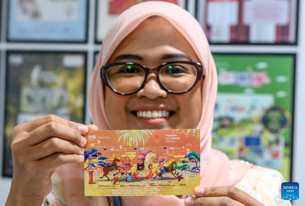 Una trabajadora muestra estampillas con temática ecuestre para conmemorar el Año del Caballo, en Kuala Lumpur, Malasia, el 29 de enero de 2026. Malasia emitió una serie de sellos para celebrar el Año del Caballo el jueves. (Xinhua/Chong Voon Chung)