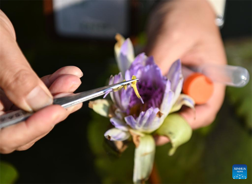 Esta foto tomada el 27 de enero de 2026 muestra a un miembro del personal recolectando polen de un nenúfar en el Jardín Botánico Yunxi de Guangzhou, en la provincia de Guangdong, sur de China. (Xinhua/Deng Hua).
