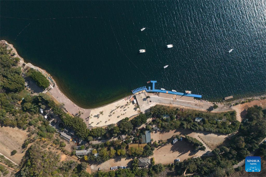Una foto aérea tomada con un dron el 27 de enero de 2026 muestra una vista del lago Fuxian en la ciudad de Yuxi, provincia de Yunnan, suroeste de China. (Xinhua/Gao Yongwei).