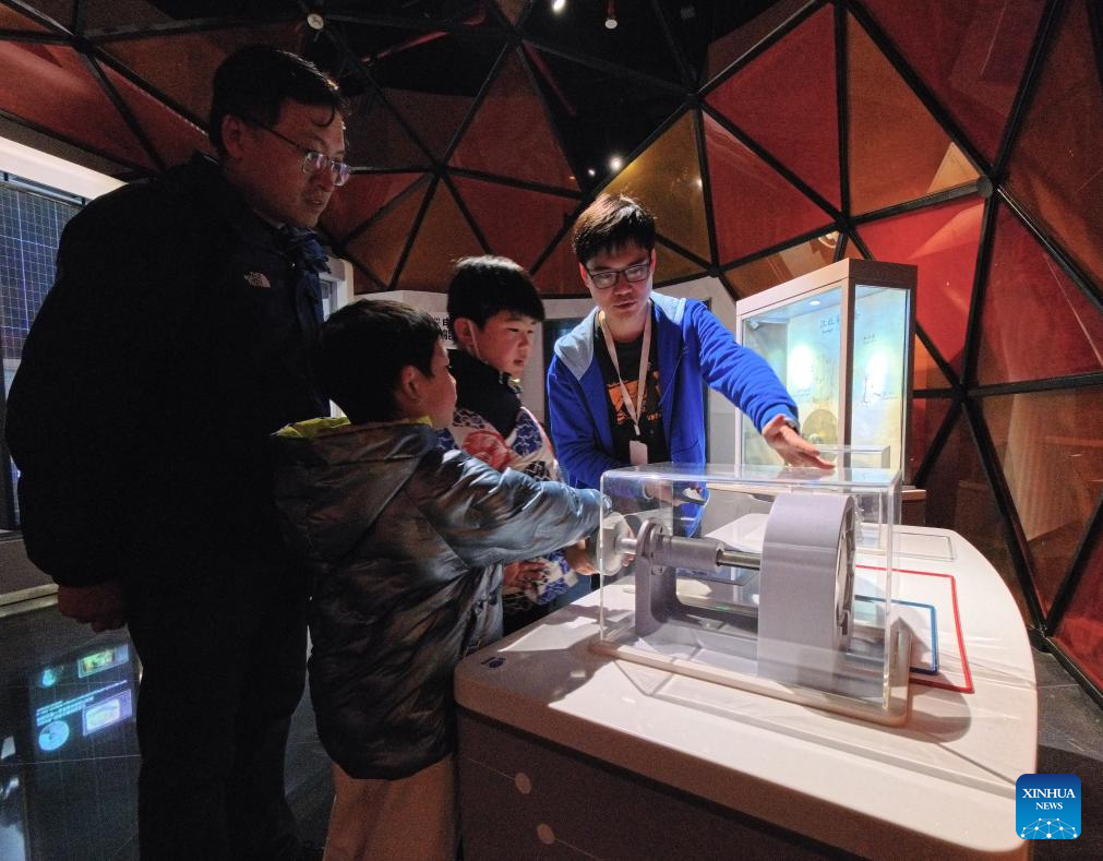Un miembro del personal (1.º por la derecha) guía a los visitantes para que prueben un juego científico en el Museo de Ciencia y Tecnología de Shanghai, en el este de China, el 27 de enero de 2026. (Xinhua/Fang Zhe).