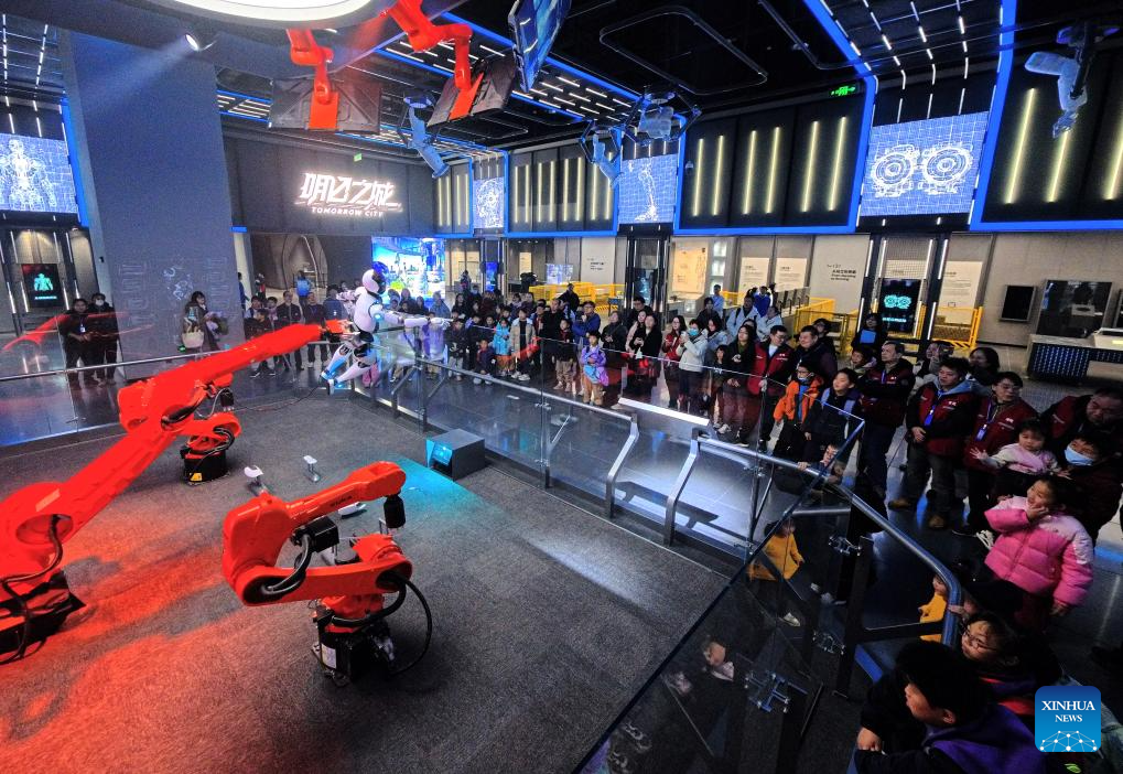 Los visitantes observan una actuación de robots en el Museo de Ciencia y Tecnología de Shanghai, en el este de China, el 27 de enero de 2026. (Xinhua/Fang Zhe).