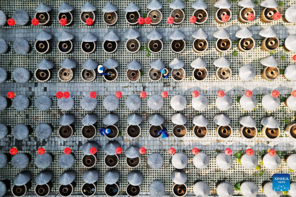 Una foto tomada con un dron el 29 de enero de 2026 muestra a unas empleadas removiendo salsa de soja en fermentación en una fábrica tradicional de Tengzhou, en la provincia de Shandong, este de China. (Foto de Li Zhijun/Xinhua).