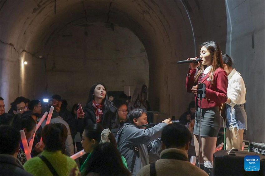 Concierto en directo celebrado en un refugio antiaéreo subterráneo en Chongqing, suroeste de China
