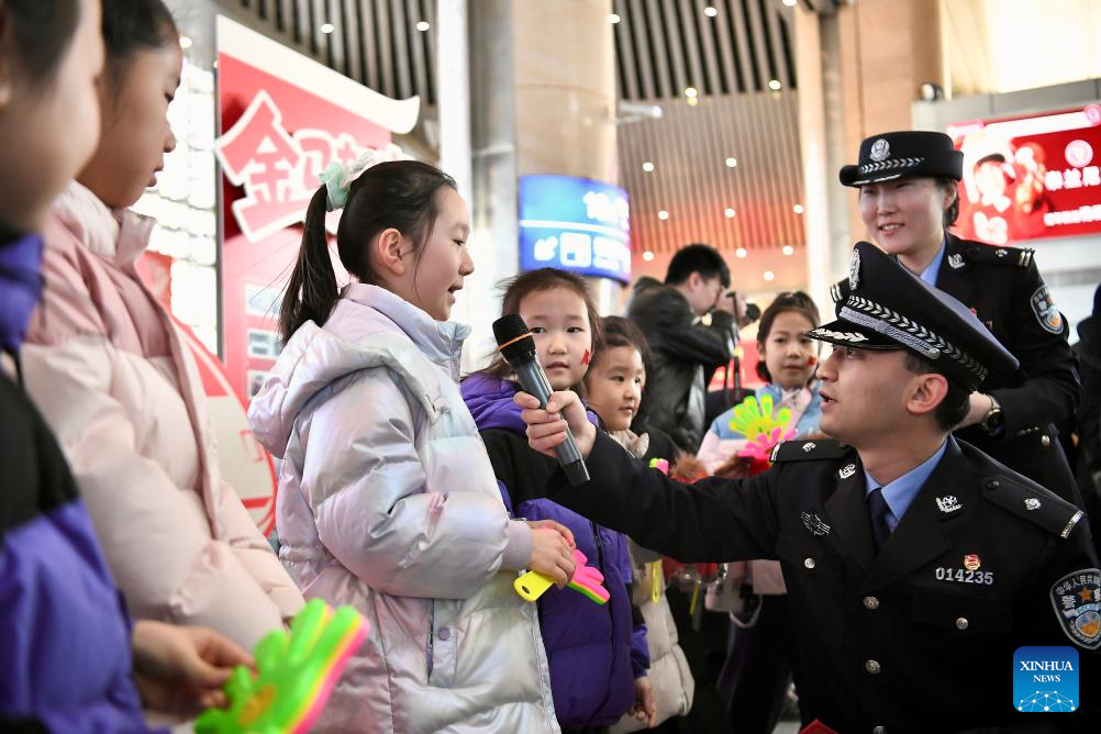 Agentes de policía interactúan con niños en la estación de tren de Tianjin, en el norte de China, el 2 de febrero de 2026. (Xinhua/Sun Fanyue).
