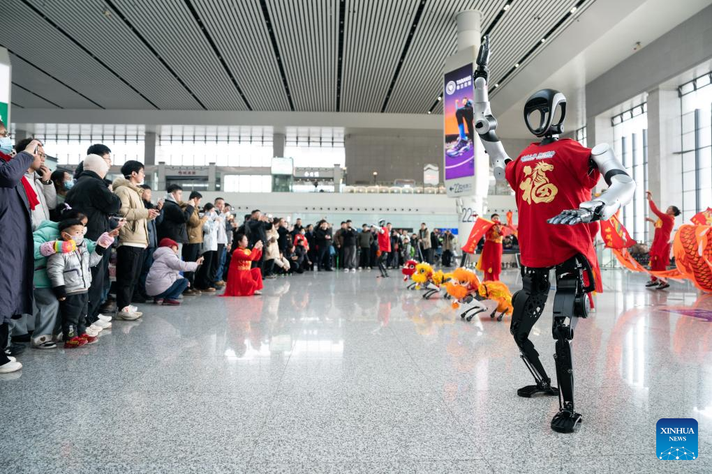 Los pasajeros observan una actuación de robots en la estación ferroviaria Hefei Sur, en Hefei, provincia de Anhui, al este de China, el 2 de febrero de 2026. (Xinhua/Du Yu).