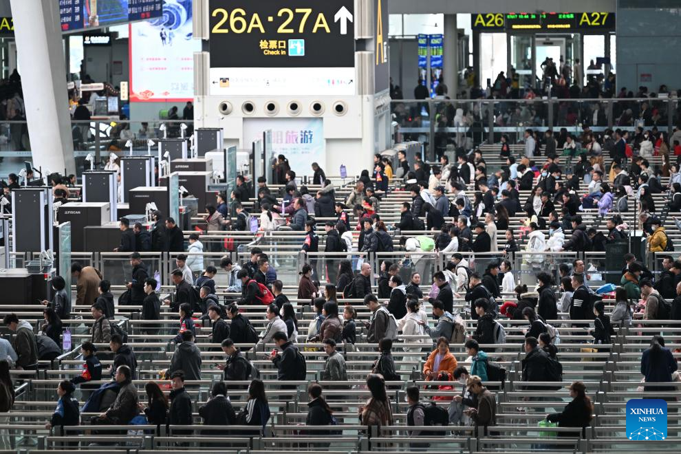 Los pasajeros hacen fila para pasar el control de seguridad en la estación ferroviaria Guangzhou Sur, en la capital de la provincia de Guangdong, sur de China, el 2 de febrero de 2026. (Xinhua/Deng Hua).