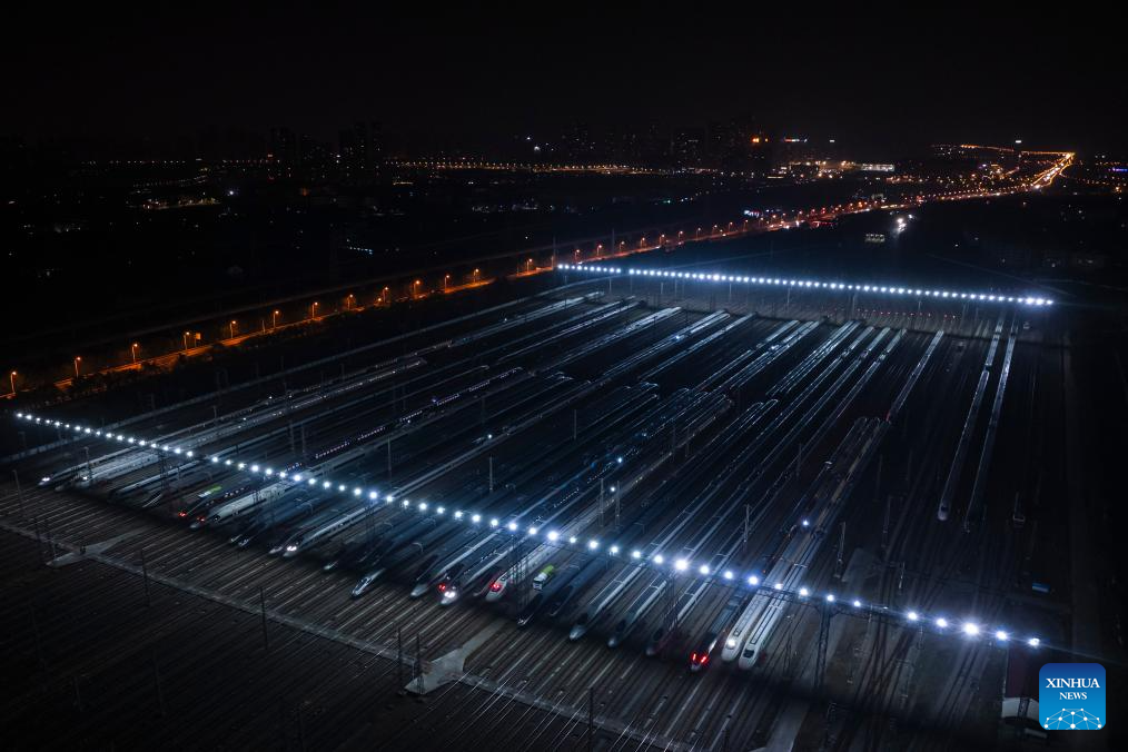 Una foto aérea tomada con un dron el 1 de febrero de 2026 muestra trenes de alta velocidad en una estación de tren en Wuhan, provincia de Hubei, centro de China. (Xinhua/Wu Zhizun).