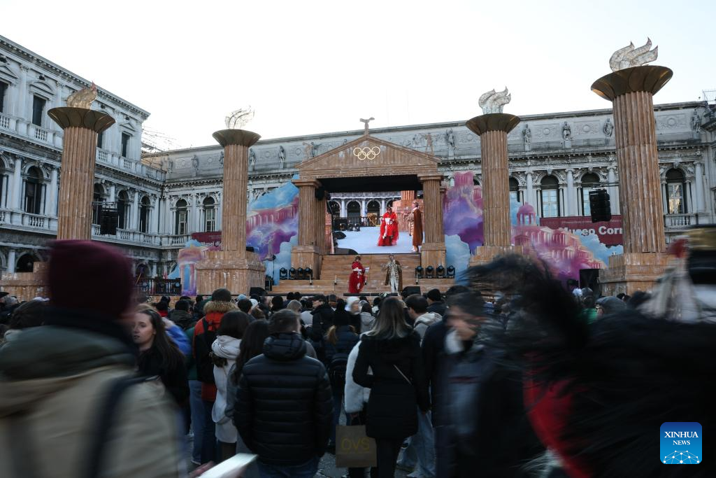 Imagen del 1 de febrero de 2026 de artistas realizando una presentación en el escenario principal del Carnaval de Venecia, que esta decorado con temática de los Juegos Olímpicos, en la Plaza de San Marcos, en Venecia, Italia. La edición de 2026 del tradicional Carnaval de Venecia se celebra del 31 de enero al 17 de febrero. (Xinhua/Li Jing)