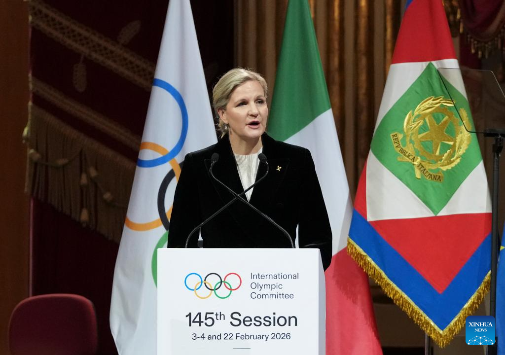 La presidenta del Comité Olímpico Internacional (COI), Kirsty Coventry, pronuncia un discurso durante la ceremonia de apertura de la Sesión 145 del COI, en el Teatro La Scala, en Milán, Italia, el 2 de febrero de 2026. (Xinhua/Sun Fei)