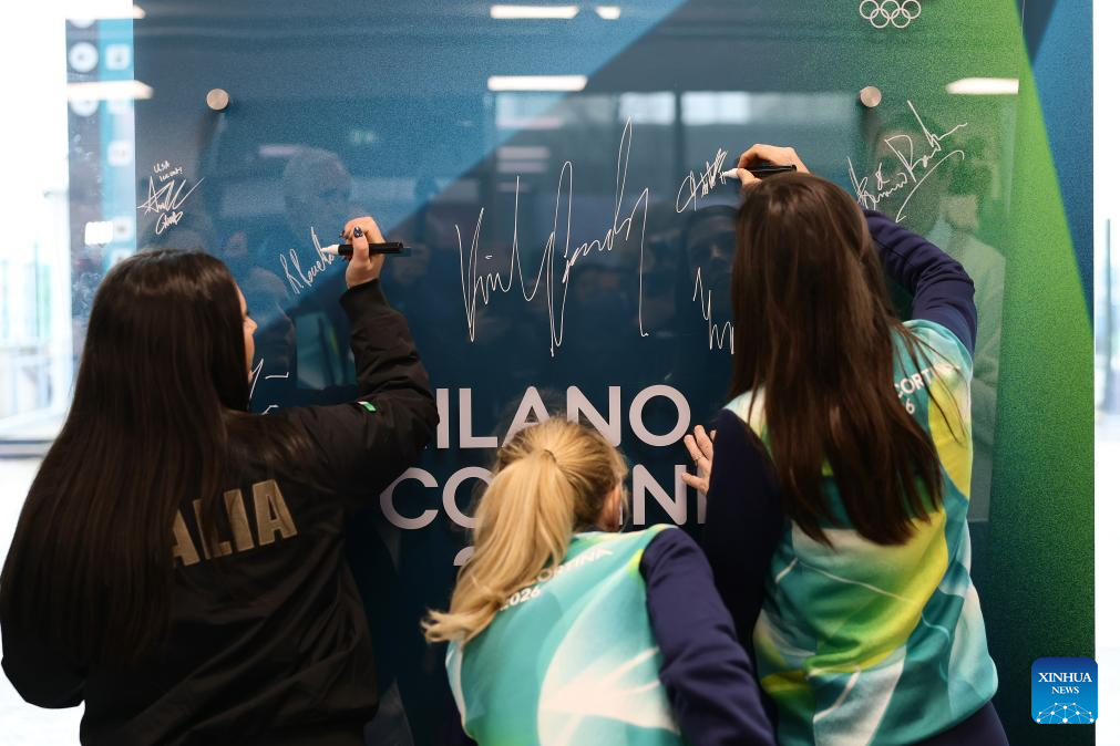 Atletas colocan sus autógrafos durante la Inauguración del Mural de la Tregua Olímpica con la Junta Ejecutiva del Comité Olímpico Internacional (COI), y la Comisión de Atletas del COI, en la Villa Olímpica de Milán, Italia, el 2 de febrero de 2026. (Xinhua/Andreas Rentz/Pool)