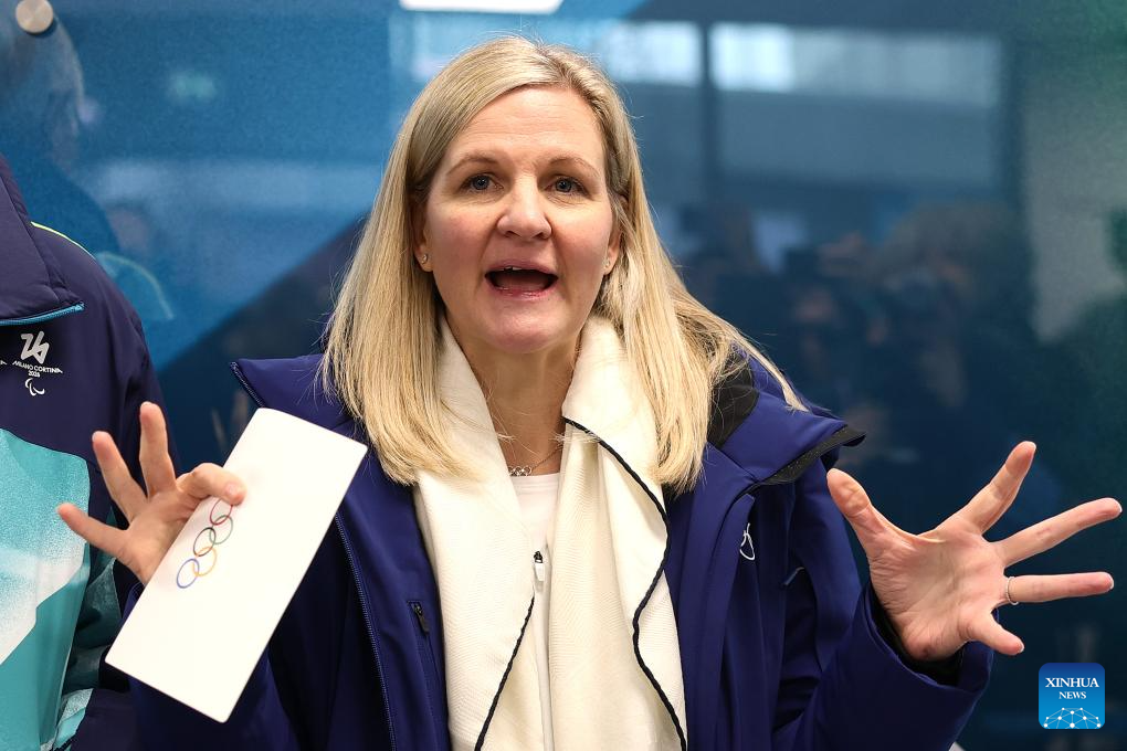 La presidenta del Comité Olímpico Internacional (COI), Kirsty Coventry, habla durante la Inauguración del Mural de la Tregua Olímpica con la Junta Ejecutiva del COI y la Comisión de Atletas del COI, en la Villa Olímpica de Milán, Italia, el 2 de febrero de 2026. (Xinhua/Andreas Rentz/Pool)