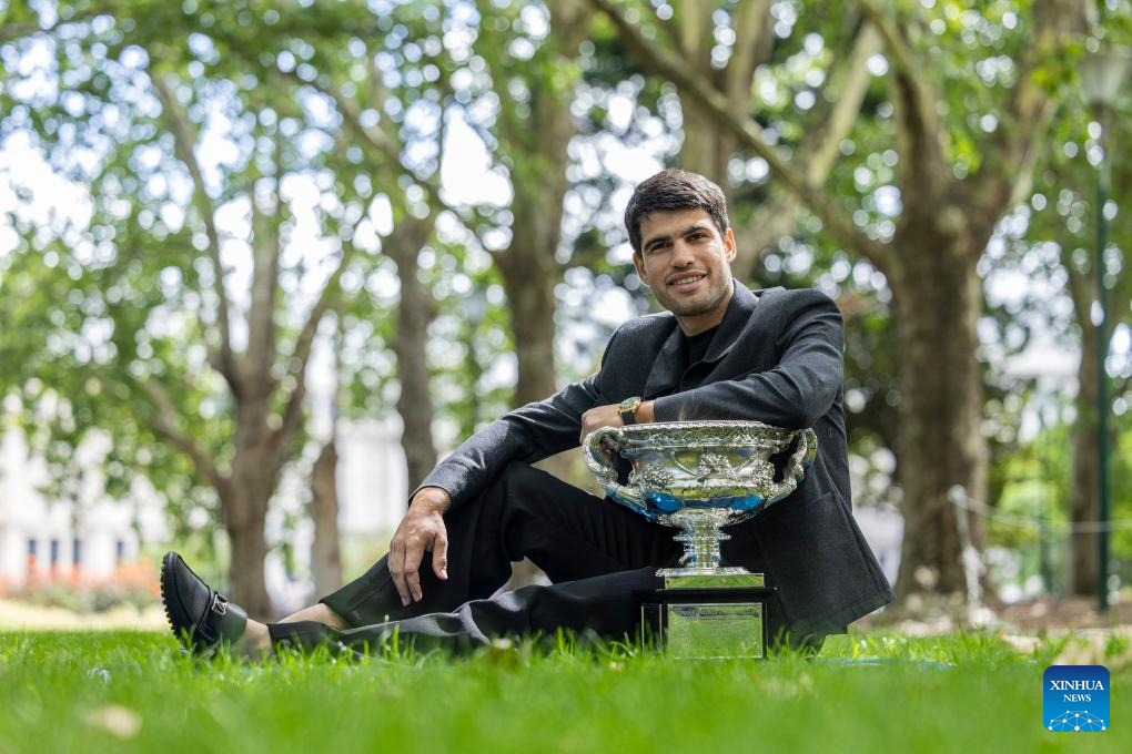 Carlos Alcaraz, de España, posan con la Copa Norman Brookes durante la oportunidad de prensa para el campeón masculino del Abierto de Australia 2026 en el Palacio Real de Exposiciones, en Melbourne, Australia, el 2 de febrero de 2026. (Xinhua/Hu Jingchen)