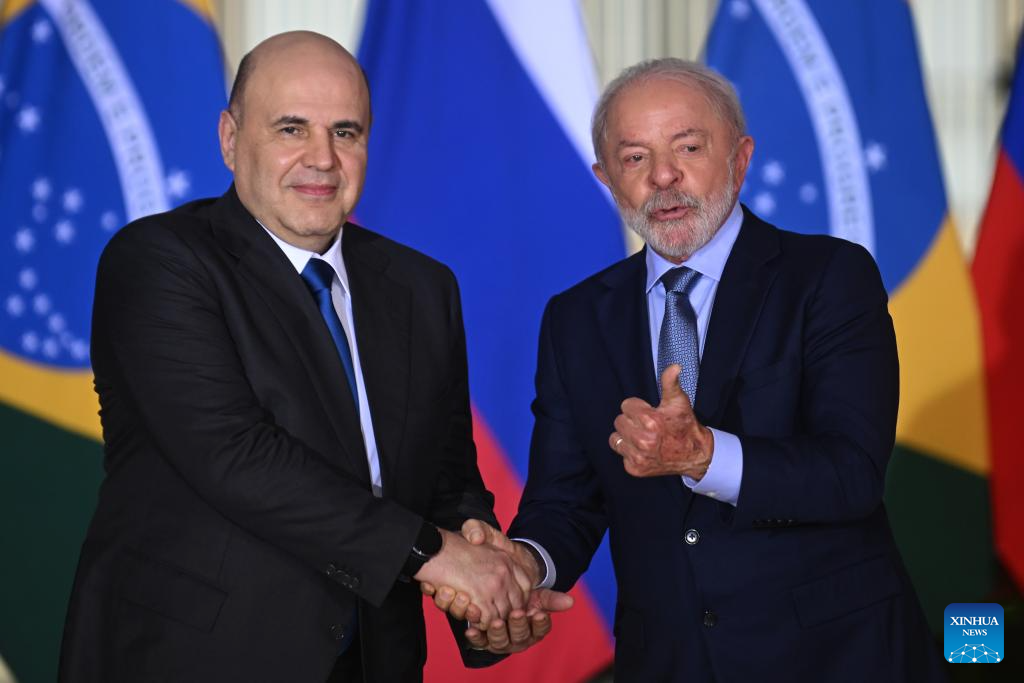 El presidente brasileño, Luiz Inácio Lula da Silva (d), estrecha la mano del primer ministro ruso, Mikhail Mishustin (i), después de una reunión bilateral en el marco de la VIII Reunión de la Comisión de Alto Nivel de Cooperación Brasil-Rusia, en el Palacio de Itamaraty, en Brasilia, Brasil, el 5 de febrero de 2026. La VIII Reunión de la Comisión de Alto Nivel de Cooperación Brasil-Rusia, tiene como objetivo fortalecer el comercio y la cooperación entre los dos países. (Xinhua/Lucio Tavora)