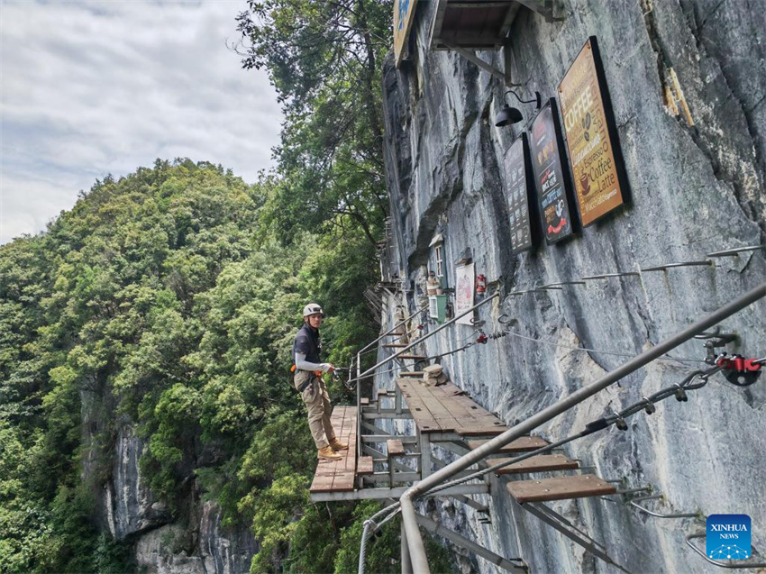 Un entrenador realiza una escalada de vía ferrata en una cafetería en un acantilado en el distrito de Libo, en la provincia de Guizhou, en el suroeste de China, el 11 de julio de 2024. (Xinhua/Wu Si).