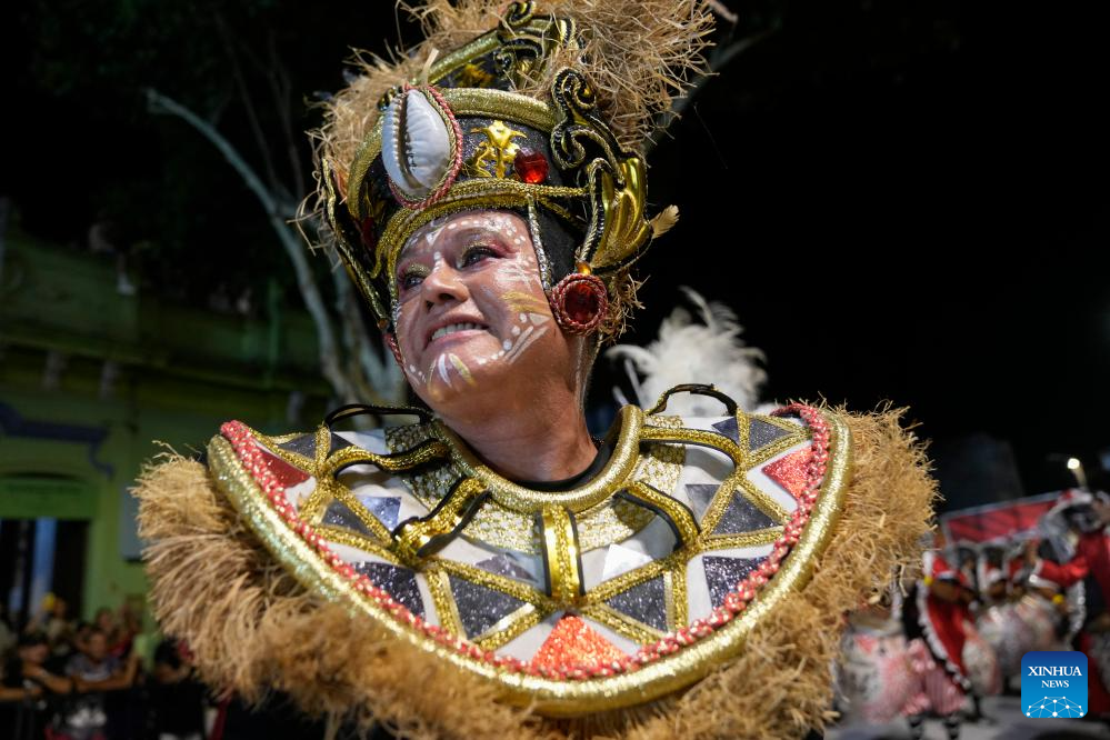 Imagen del 6 de febrero de 2026 de una mujer participando en una comparsa durante el desfile de Llamadas, en Montevideo, capital de Uruguay. Más de 3.000 tambores resuenan el viernes y el sábado en Montevideo durante el tradicional desfile de Llamadas, la principal expresión del candombe, ritmo de raíz africana y Patrimonio Cultural Inmaterial de la Humanidad, que celebra su 70 edición en el marco del Carnaval de Uruguay. (Xinhua/Nicolás Celaya)
