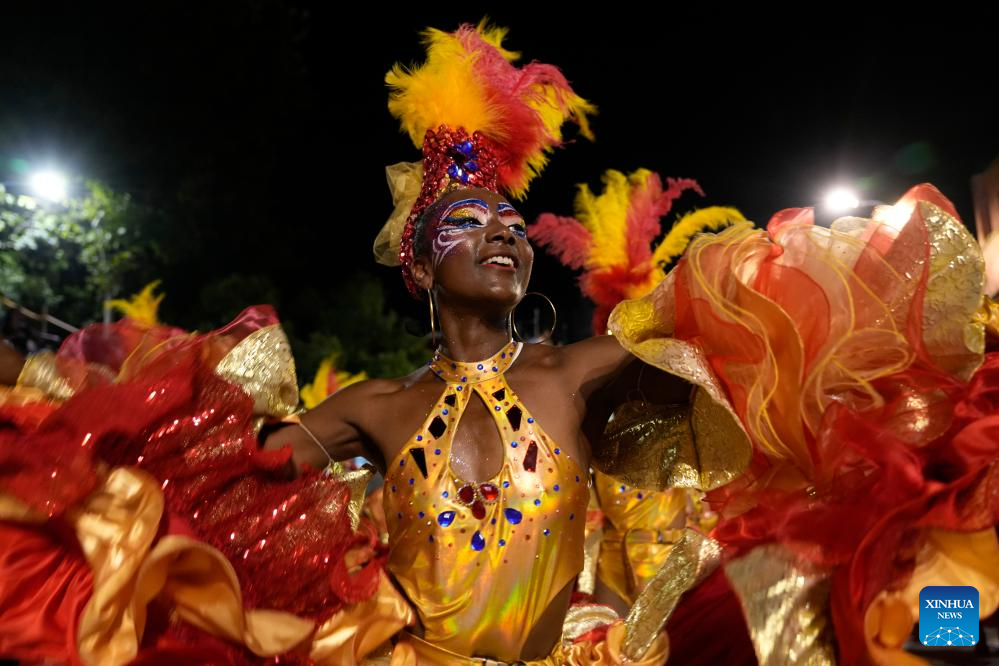 Imagen del 6 de febrero de 2026 de una mujer participando en una comparsa durante el desfile de Llamadas, en Montevideo, capital de Uruguay. Más de 3.000 tambores resuenan el viernes y el sábado en Montevideo durante el tradicional desfile de Llamadas, la principal expresión del candombe, ritmo de raíz africana y Patrimonio Cultural Inmaterial de la Humanidad, que celebra su 70 edición en el marco del Carnaval de Uruguay. (Xinhua/Nicolás Celaya)