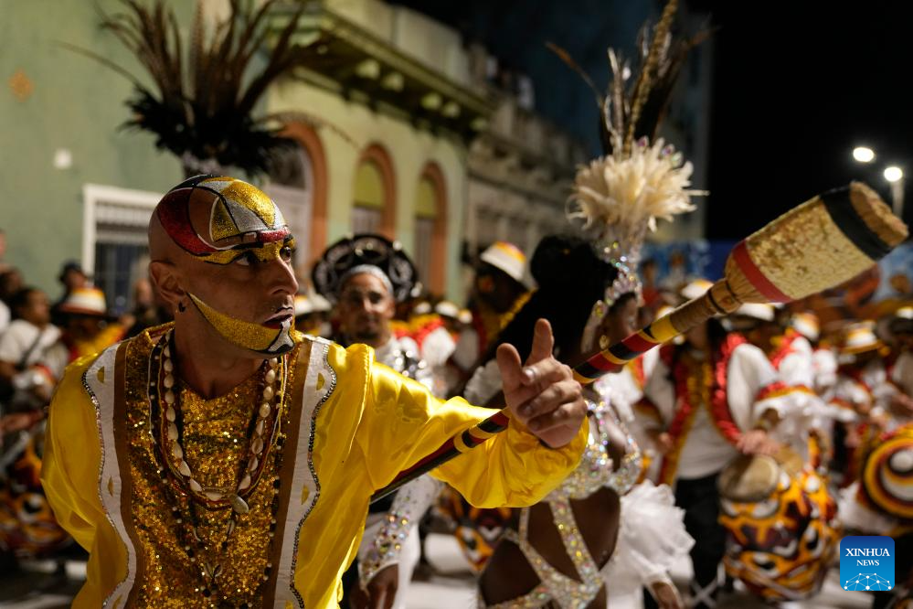 Imagen del 6 de febrero de 2026 de un hombre participando en una comparsa durante el desfile de Llamadas, en Montevideo, capital de Uruguay. Más de 3.000 tambores resuenan el viernes y el sábado en Montevideo durante el tradicional desfile de Llamadas, la principal expresión del candombe, ritmo de raíz africana y Patrimonio Cultural Inmaterial de la Humanidad, que celebra su 70 edición en el marco del Carnaval de Uruguay. (Xinhua/Nicolás Celaya)