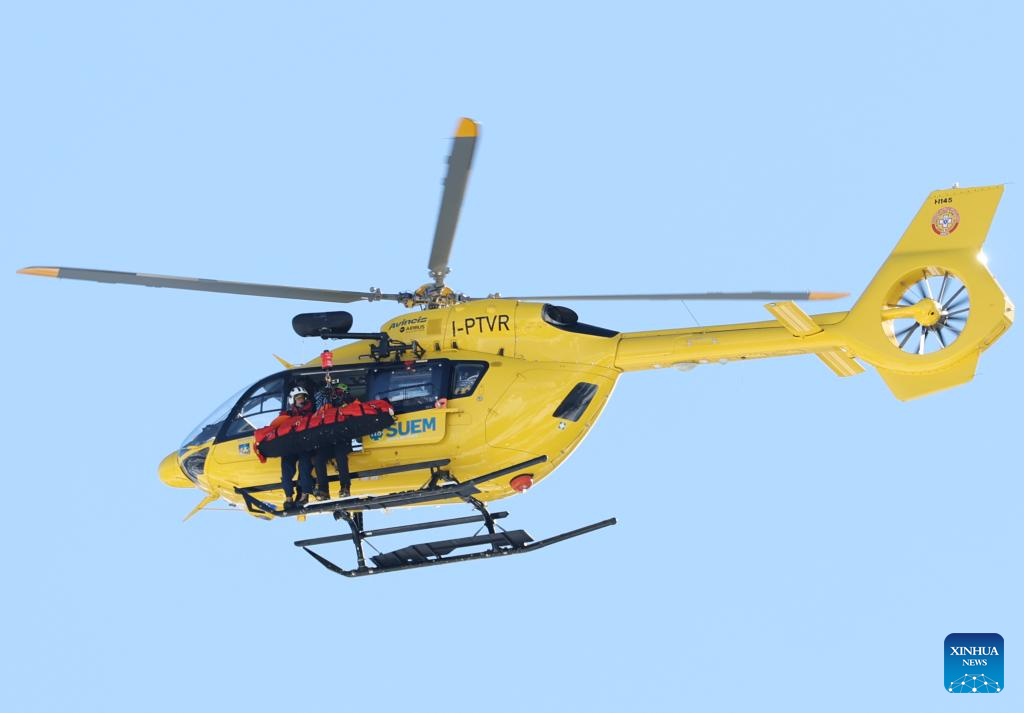 La esquiadora estadounidense Lindsey Vonn es trasladada en helicóptero después de lesionarse durante el descenso femenino de esquí alpino de los Juegos Olímpicos de Invierno Milán-Cortina 2026, en Cortina, Italia, el 8 de febrero de 2026. (Xinhua/Zhang Chenlin)