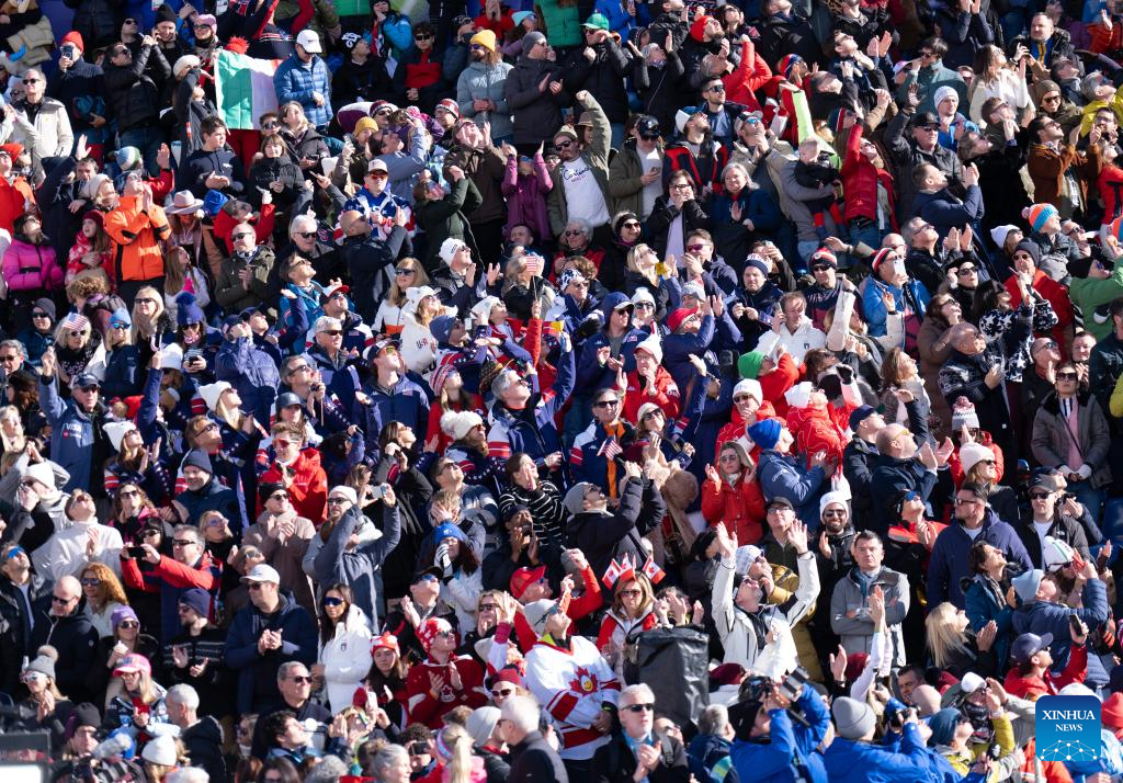 Espectadores observan cómo un helicóptero traslada a la esquiadora estadounidense Lindsey Vonn después de lesionarse durante el descenso femenino de esquí alpino de los Juegos Olímpicos de Invierno Milán-Cortina 2026, en Cortina, Italia, el 8 de febrero de 2026. (Xinhua/Fei Maohua)