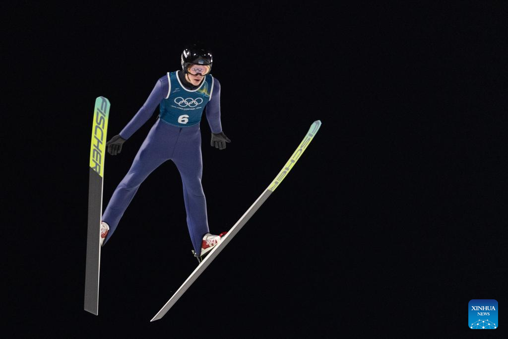 Imagen del 8 de febrero de 2026 de Kaimar Vagul, de Estonia, compitiendo durante el segundo Entrenamiento Oficial de trampolín normal masculino de salto de esquí en los Juegos Olímpicos de Invierno Milán-Cortina 2026, en Predazzo, Italia. (Xinhua/Huang Wei)