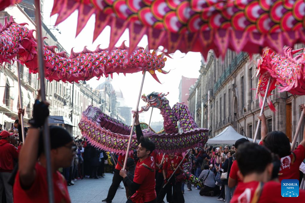 Imagen del 7 de febrero de 2026 de personas participando en la danza del dragón, durante el 8 Concurso de Disfraces "Año del Caballo", en el marco de la celebración del Año Nuevo chino, en la Ciudad de México, capital de México.Con un ambiente festivo, familiar y lleno de color, más de 15.000 personas se congregaron el sábado en el corazón de la Ciudad de México para participar en las celebraciones del Año Nuevo chino en el país latinoamericano, que incluyeron un vistoso desfile de leones y dragones, así como un concurrido concurso de disfraces inspirado en los animales del zodiaco. (Xinhua/Francisco Cañedo)