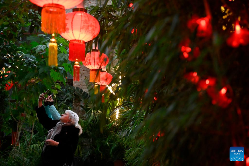 Imagen del 7 de febrero de 2026 de visitantes tomando fotografías de las decoraciones del Festival de la Primavera en el invernadero subtropical del Jardín Botánico de la Universidad Estatal de Moscú, en Moscú, Rusia. (Xinhua/Alexander Zemlianichenko Jr)