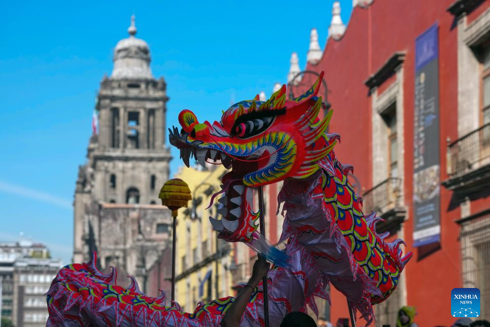 Imagen del 7 de febrero de 2026 de personas realizando una presentación de la danza del dragón durante el 8 Concurso de Disfraces "Año del Caballo", en el marco de la celebración del Año Nuevo chino, en la Ciudad de México, capital de México. (Xinhua/Li Muzi)
