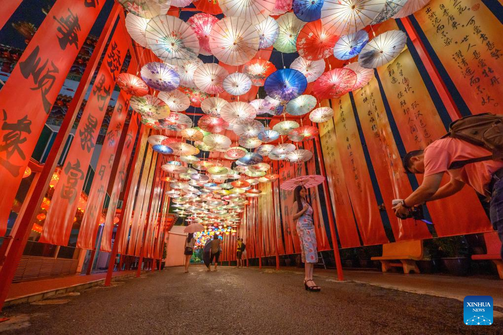 Personas toman fotografías de decoraciones festivas en el templo Thean Hou, en Kuala Lumpur, Malasia, el 7 de febrero de 2026. Una serie de celebraciones se han llevado a cabo para conmemorar el próximo Año Nuevo chino, o Fiesta de la Primavera. (Xinhua/Chong Voon Chung)