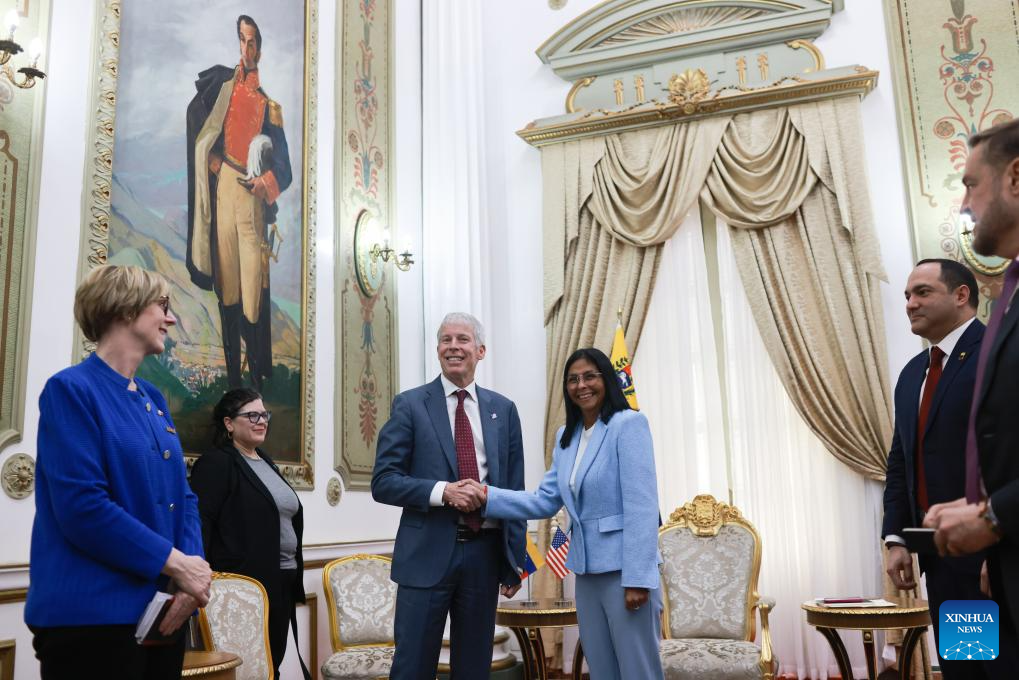 Imagen proveída por la Presidencia de Venezuela de la presidenta encargada venezolana, Delcy Rodríguez (3-d), estrechando la mano con el secretario de Energía de Estados Unidos, Christopher Wright (3-i), en el Palacio de Miraflores, sede del Gobierno venezolano, en Caracas, Venezuela, el 11 de febrero de 2026. Rodríguez recibió el miércoles en el Palacio de Miraflores, sede del Gobierno venezolano, a Wright, con el objetivo de revisar la agenda bilateral en beneficio de ambos países. (Xinhua/Presidencia de Venezuela)