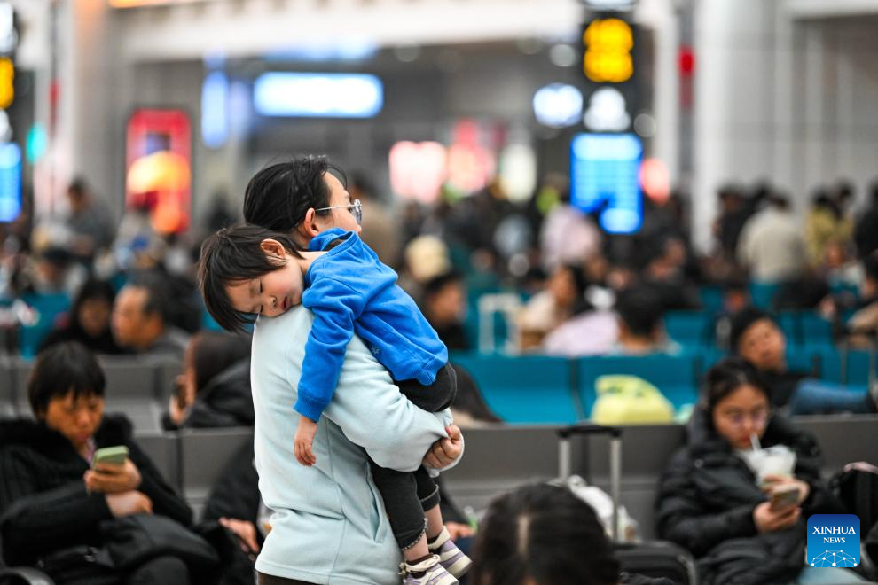 Pasajeros son vistos en la sala de espera de la Estación de Ferrocarril Norte de Chongqing, en Chongqing, en el suroeste de China, el 23 de febrero de 2026. El operador ferroviario nacional de China informó que el lunes 23 de febrero, último día de las vacaciones de nueve días por la Fiesta de la Primavera, probablemente registrará el pico más alto de viajes de retorno de pasajeros, y pronosticó que hasta 18,5 millones de viajes se realizarán a través del sistema ferroviario en esta jornada. (Xinhua/Tang Yi)