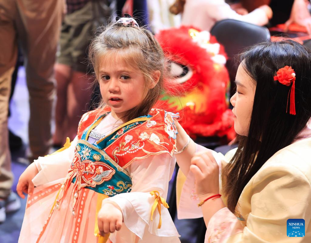 Una niña con vestimenta tradicional china es vista durante una celebración de la Fiesta de la Primavera, en Wellington, Nueva Zelanda, el 22 de febrero de 2026. (Xinhua/Meng Tao)