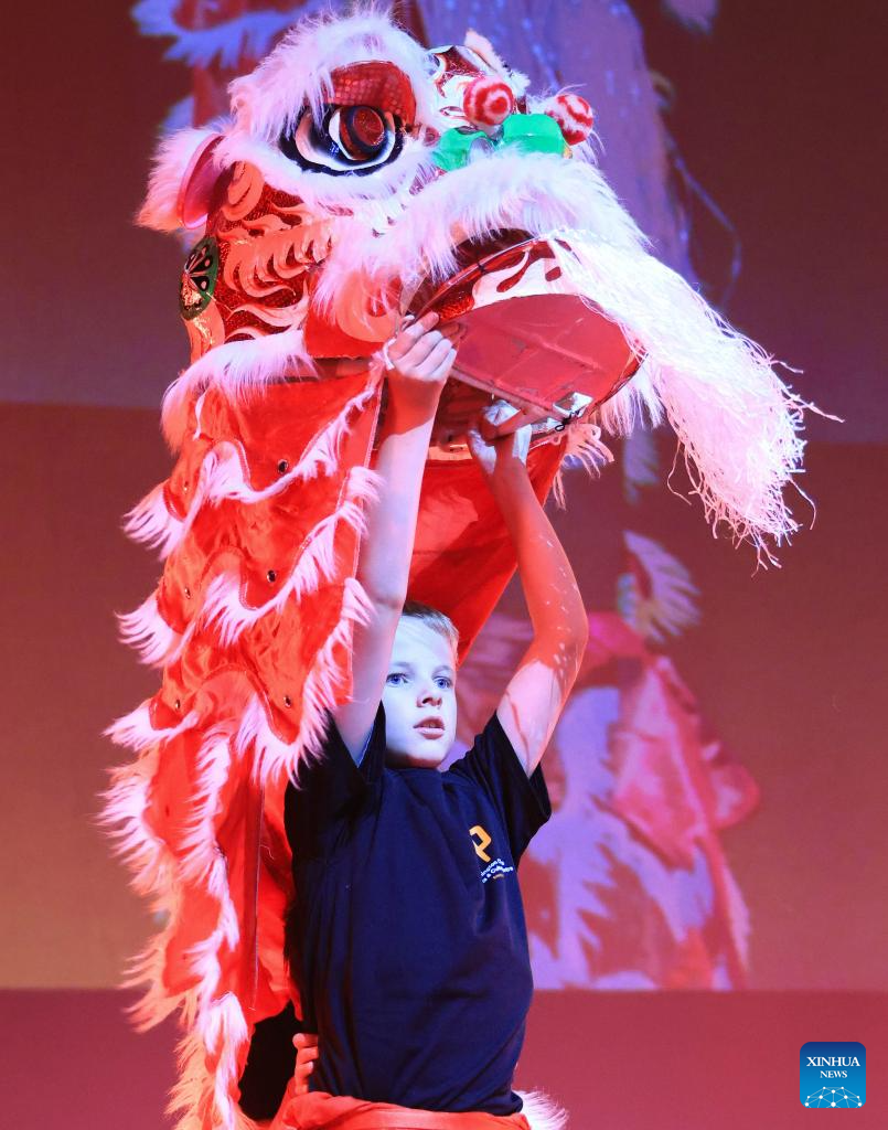 Un niño realiza una presentación de la danza del león durante una celebración de la Fiesta de la Primavera, en Wellington, Nueva Zelanda, el 22 de febrero de 2026. (Xinhua/Meng Tao)