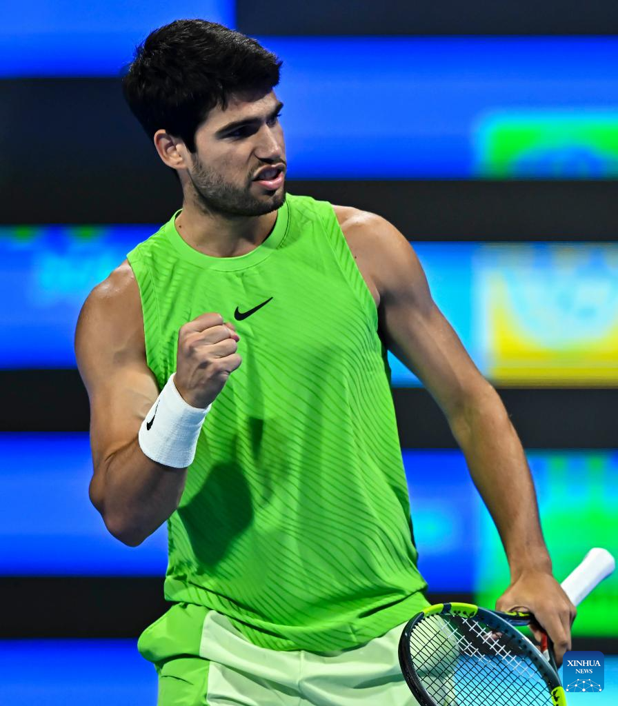 Imagen del 21 de febrero de 2026 de Carlos Alcaraz, de España, reaccionando durante el partido final de individuales masculinos entre Carlos Alcaraz, de España, y Arthur Fils, de Francia, en el torneo de tenis Abierto de Qatar de la ATP 2026, en Doha, Qatar. (Xinhua/Nikku)