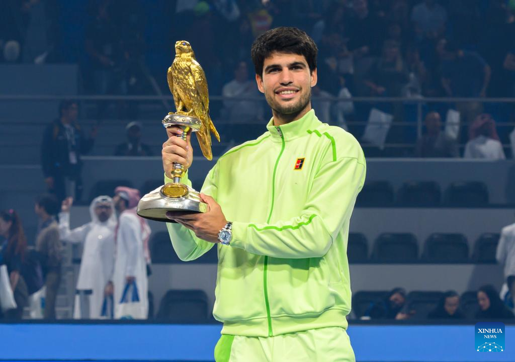 Imagen del 21 de febrero de 2026 del campeón Carlos Alcaraz, posando con el trofeo durante la ceremonia de premiación al término del partido final de individuales masculinos entre Carlos Alcaraz, de España, y Arthur Fils, de Francia, en el torneo de tenis Abierto de Qatar de la ATP 2026, en Doha, Qatar. (Xinhua/Nikku)