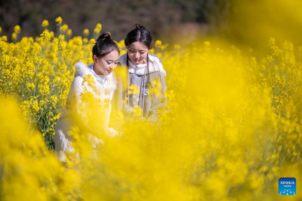 Turistas visitan un campo de flores de colza en la aldea de Shangbugao, distrito de Maguan, prefectura autónoma de las etnias zhuang y miao de Wenshan, provincia de Yunnan, suroeste de China, el 22 de febrero de 2026. (Foto de Xiong Pingxiang/Xinhua).
