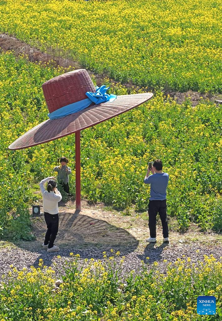 Una foto tomada con un dron el 21 de febrero de 2026 muestra a turistas visitando un campo de flores de colza en la localidad de Baita, distrito de Xianju, ciudad de Taizhou, provincia de Zhejiang, en el este de China. (Foto de Wang Huabin/Xinhua).