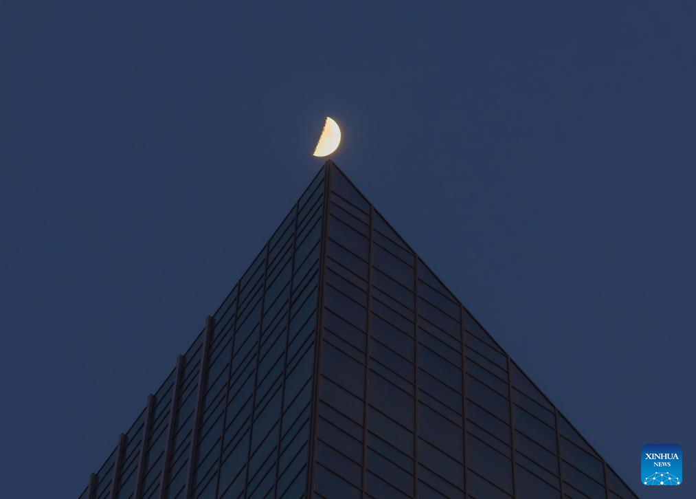 Una foto tomada con un dron el 24 de febrero de 2026 muestra la Luna sobre la ciudad de Harbin, en la provincia de Heilongjiang, en el noreste de China. (Foto de Liu Dapeng/Xinhua).