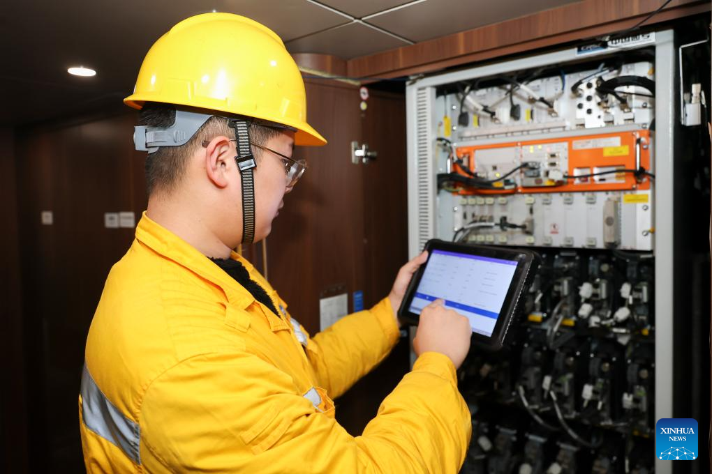 Un trabajador recopila datos de un armario de datos con un dispositivo portátil a bordo de un tren en la sección de señales y comunicaciones de Shanghai de China Railway Shanghai Group Co., Ltd., en Shanghai, este de China, el 28 de febrero de 2026. (Xinhua/Wang Xiang).