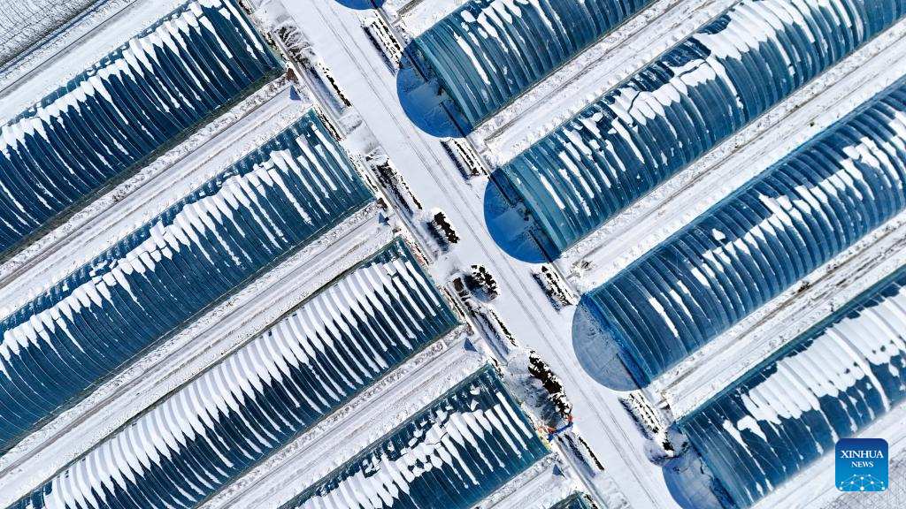Una foto aérea tomada con un dron el 28 de febrero de 2026 muestra los invernaderos para el cultivo de plántulas de arroz en la granja Youyi Farm Co., Ltd., perteneciente al grupo Beidahuang, en la ciudad de Shuangyashan, provincia de Heilongjiang, en el noreste de China. (Xinhua/Wang Song).